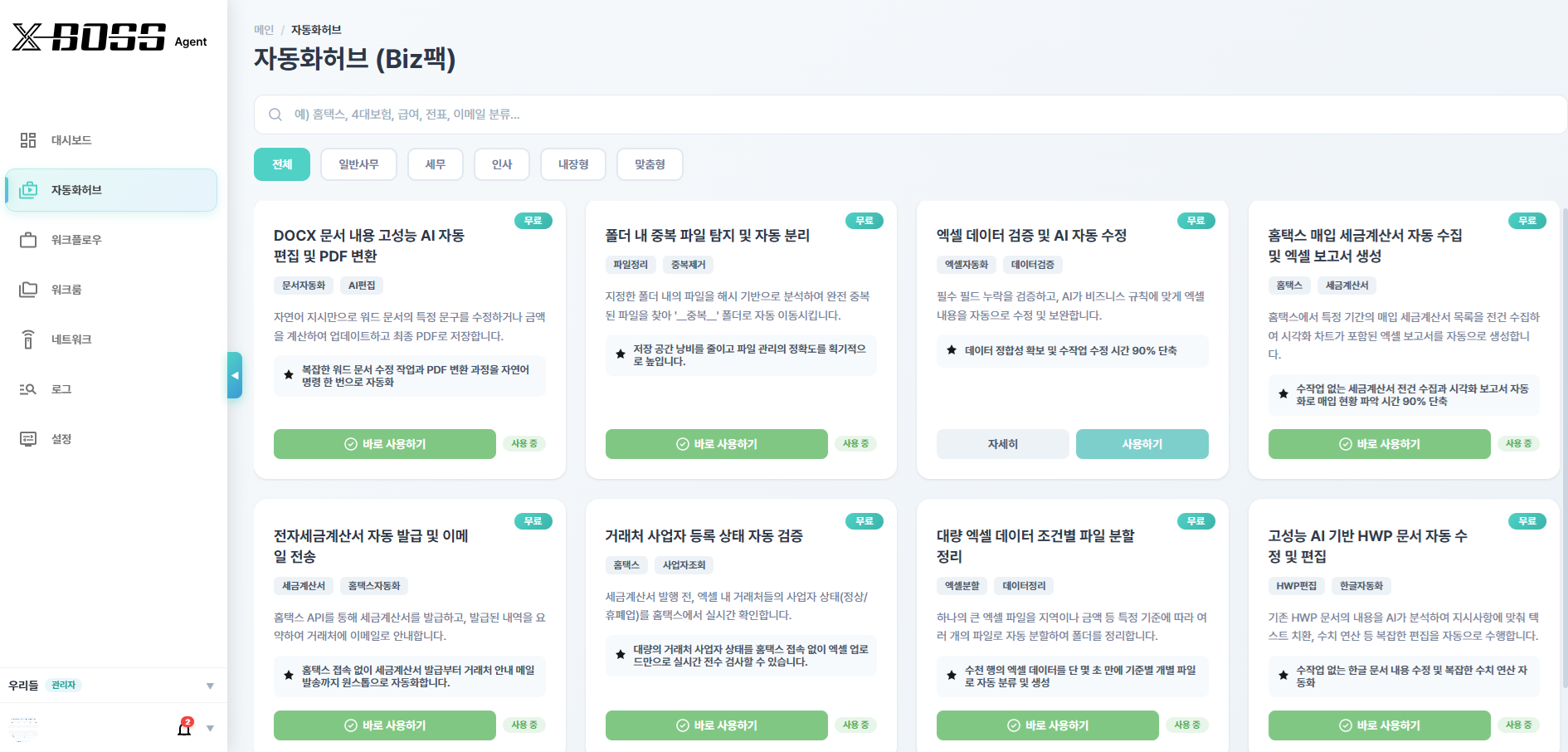 - 다양한 도구 지원: 고성능 AI를 활용한 DOCX/HWP 문서 편집, 홈택스 매입 세무 신고 자동화, 대량 엑셀 데이터 분할 및 검증 등 실무 밀착형 봇들이 이미 준비되어 있습니다.