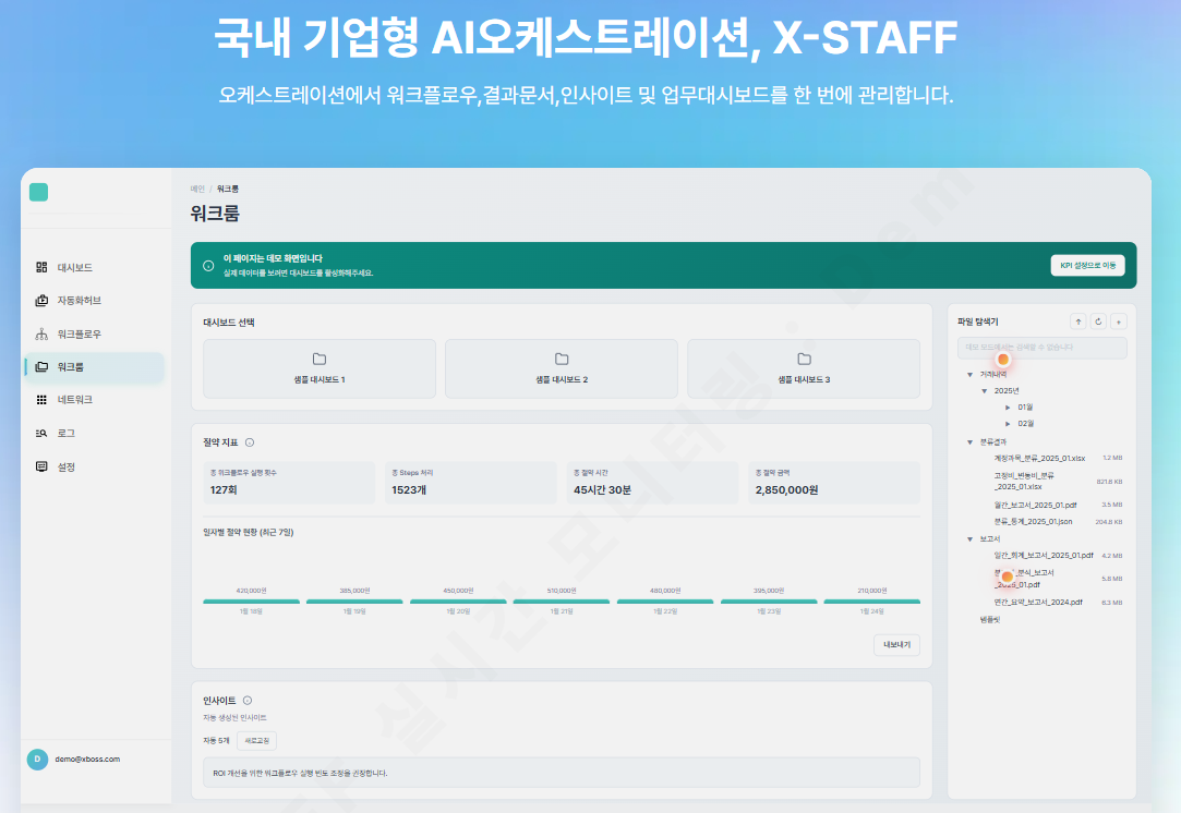 XSTAFF는 자동화 결과만 보여주는 것이 아닙니다. 워크플로우 수행 과정에서 생성된 모든 산출물을 분석하여 AI 기반의 인사이트 지표와 그래프를 자동으로 생성합니다. "우리 팀의 업무 효율이 얼마나 올랐는가?", "어떤 단계에서 병목이 생기는가?"를 수치로 보여주어 경영진의 핵심 의사결정 자료로 기능합니다.
