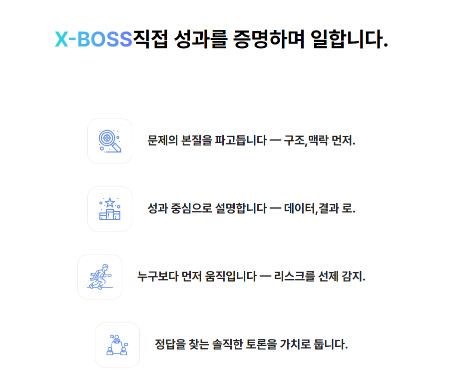 엑스보스는 단순 기술 공급자를 넘어, 고객사의 비즈니스 구조를 이해하고 최적의 자동화 로드맵을 함께 그려나가는 전략적 동반자입니다. 우리 회사의 AX 준비도가 궁금하시다면, 엑스보스의 전문가 진단부터 받아보시는 것은 어떨까요?