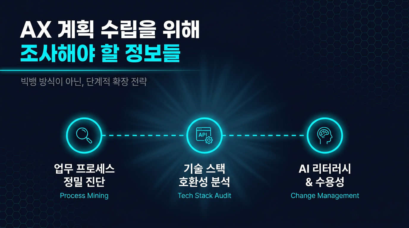 AX는 '빅뱅' 방식보다는 '단계적 확장' 전략이 훨씬 유리합니다. 이를 위해 다음의 정보들을 우선적으로 수집하고 분석해야 합니다.